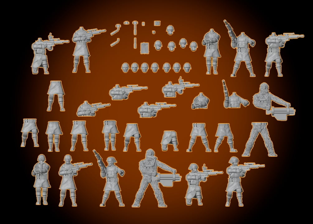 This set includes the fully posed Paratroopers, the Head Swap bodies, and the mix and match format as well as additional gear options like pouches and gasmasks. It does NOT INCLUDE SUPPORTED FILES for the Head Swap and Mix and Match parts or gear, but does include supported files for the fully posed figures as a courtesy